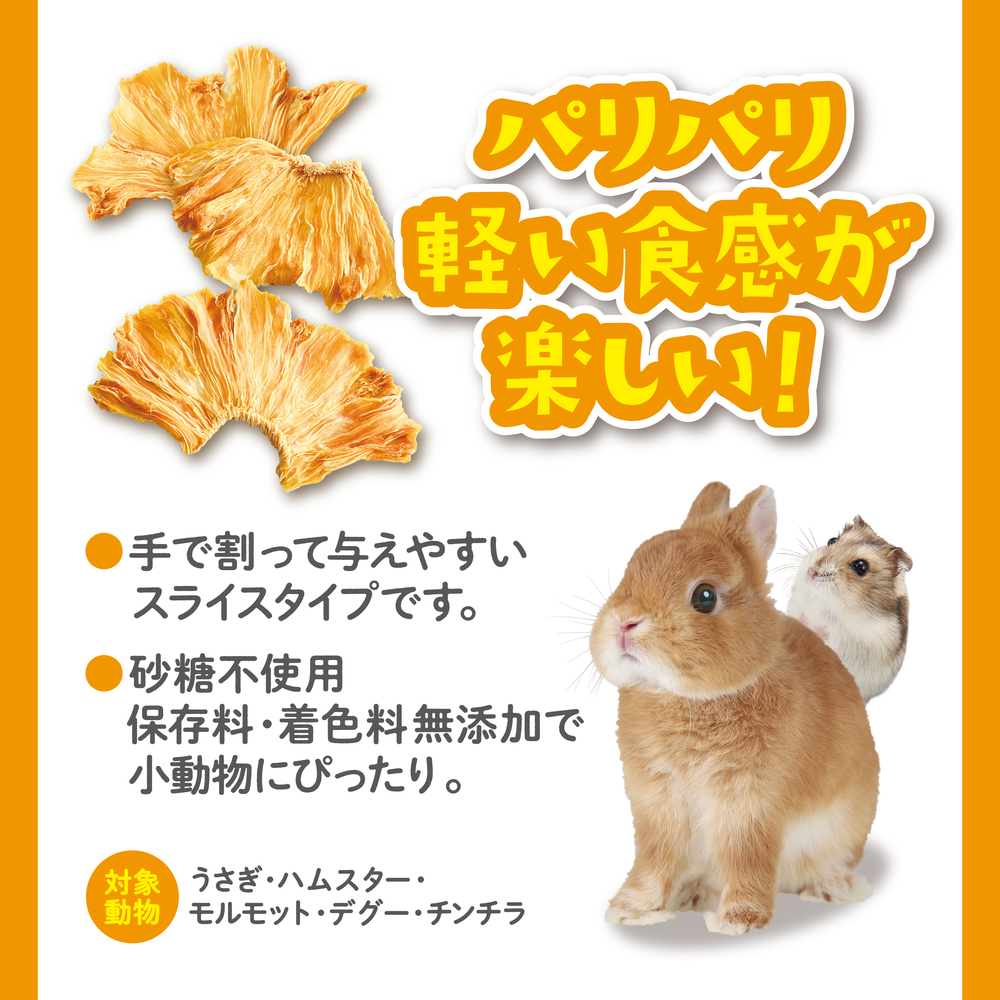 【パリパリ食感のスライスタイプ】パリパリとした軽い食感が楽しく、手で割って与えやすいスライスタイプ。