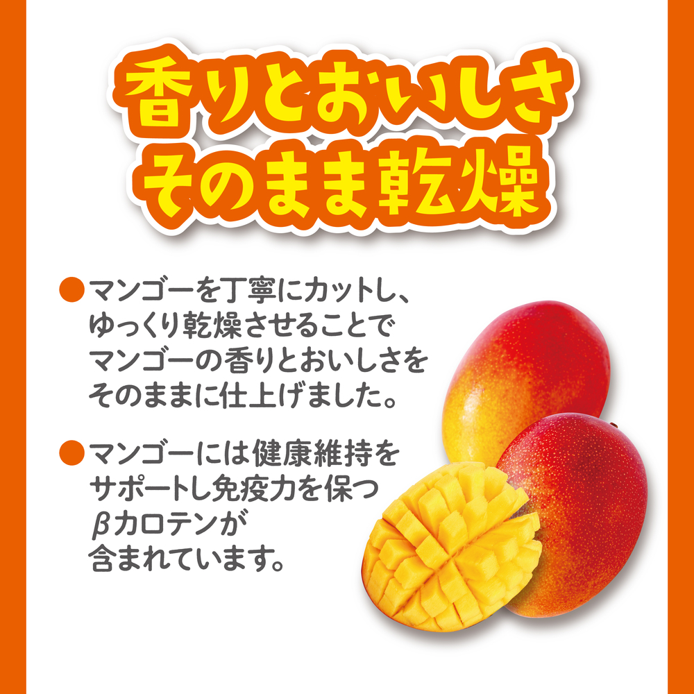 【マンゴーの風味をそのままに】マンゴーを丁寧にカットし、ゆっくり乾燥させることで、マンゴー本来の香りとおいしさをそのまま。