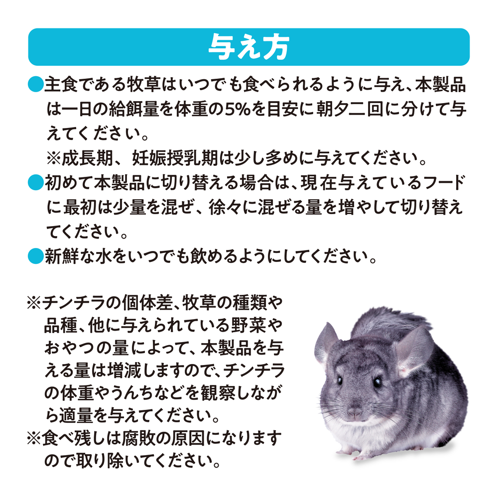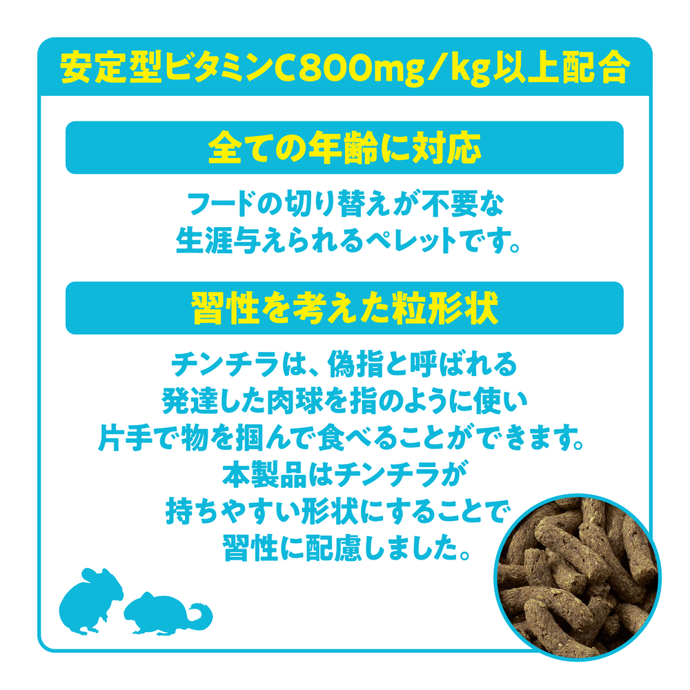 【RNAヌクレオチド配合】:母乳にも含まれる成分で、チンチラの健康をサポートし免疫力を維持。