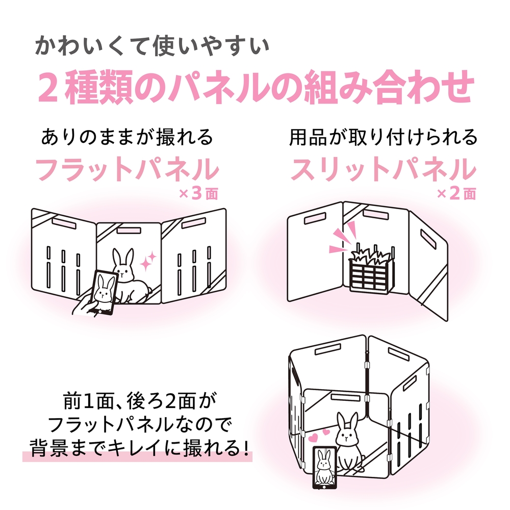 【用途に合わせて使い分けられる2種類のパネル構成】うさぎの姿をクリアに撮影できる「フラットパネル」と、牧草入れなどの用品を取り付けられる「スリットパネル」が組み合わされており、可愛さと使い勝手を両立。