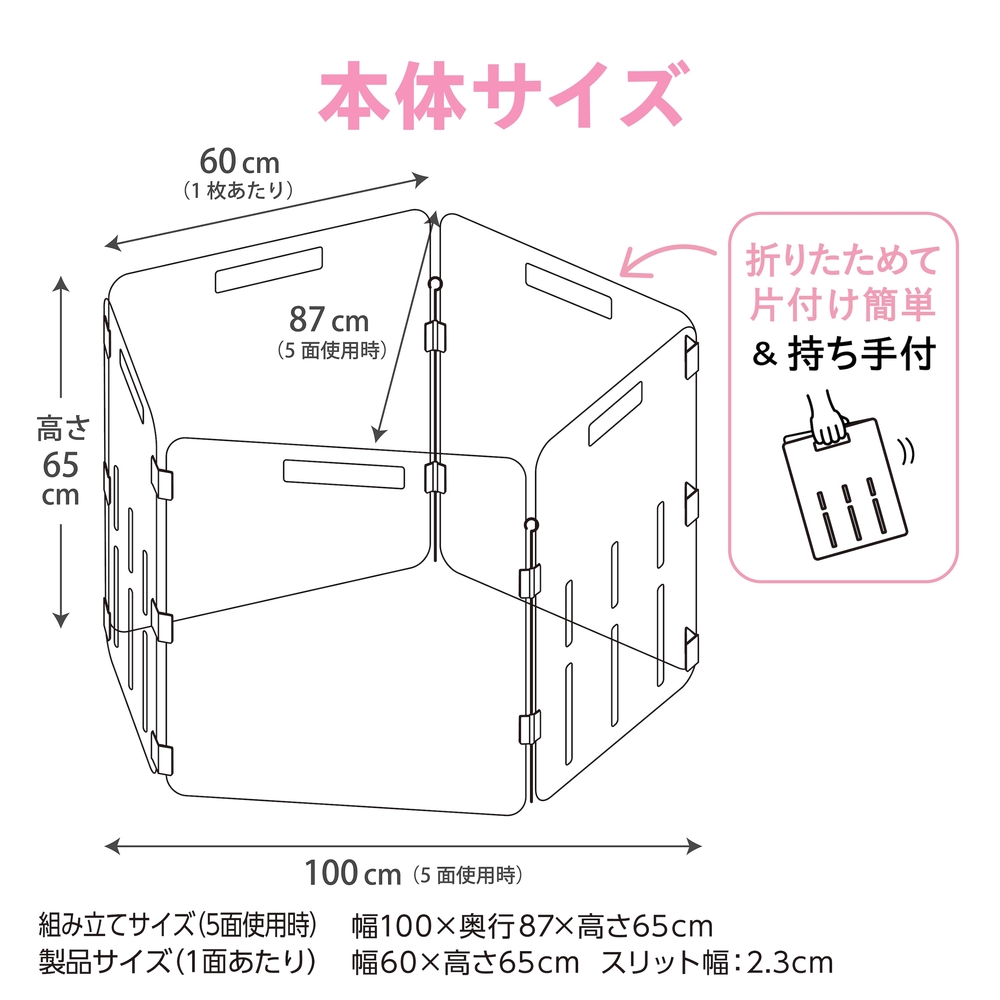 【5面使用時のゆったりとしたサイズ設計】5面のパネルを使用した場合、幅は約100.0cm、奥行きは約87.0cm、高さは65.0cmという広々とした組み立てサイズになります。