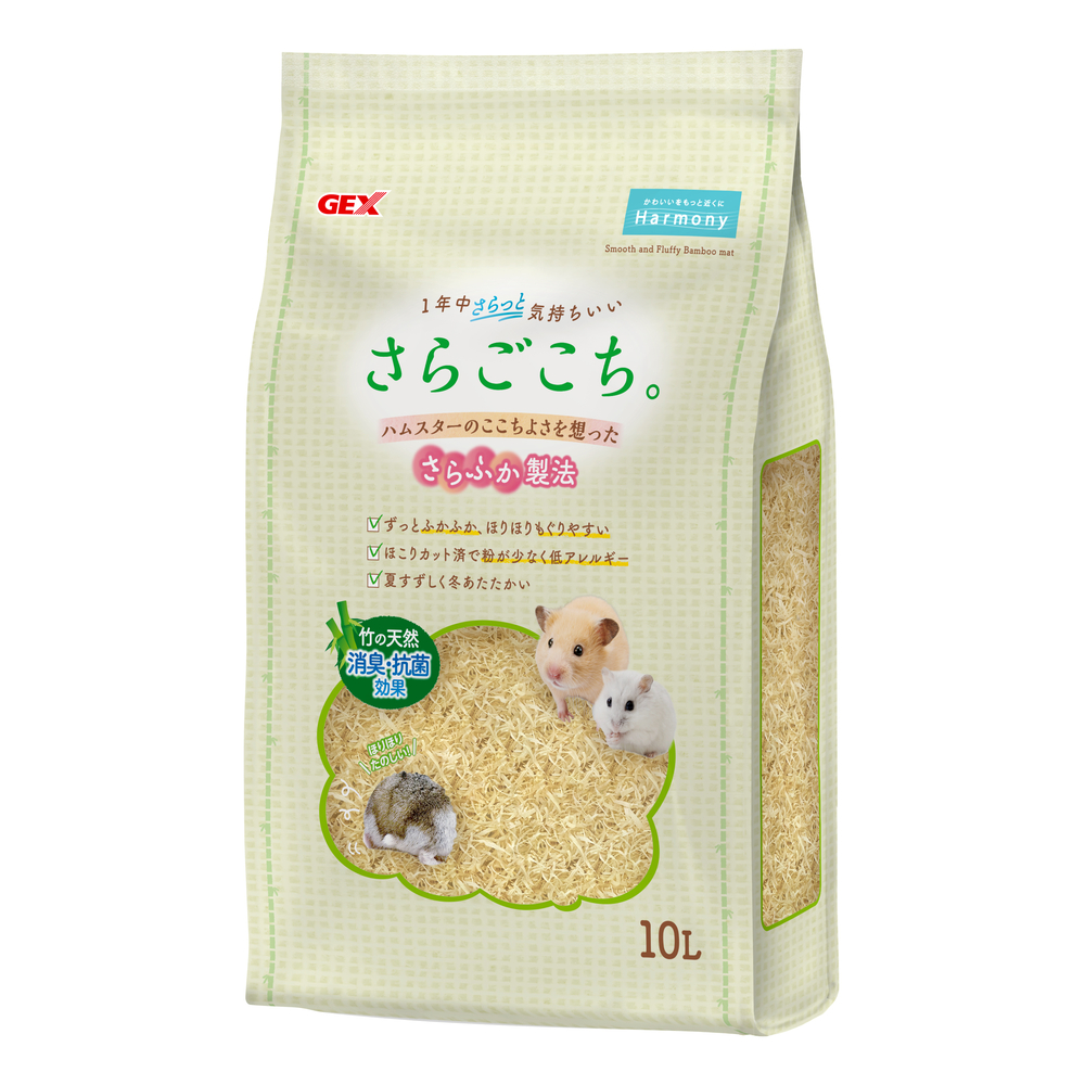 ハムスターがもぐりやすい、ほこりが少なく低アレルギーな天然素材の床材。消臭・抗菌効果のある竹原料を使用。