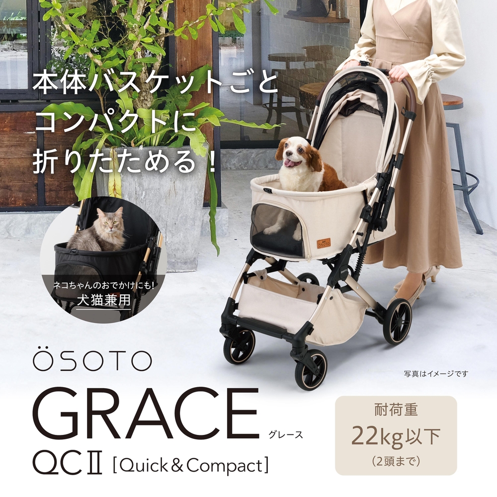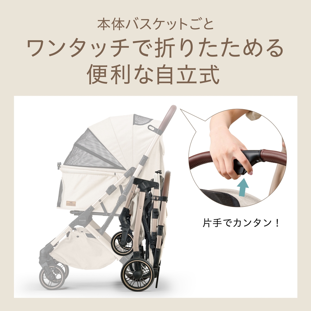 おでかけに煌めきを 本体バスケットごとワンタッチでコンパクトに折りたためる犬猫用バギー 玄関・車への載せ降ろし・お出かけ先でもスマートに収納ができる。