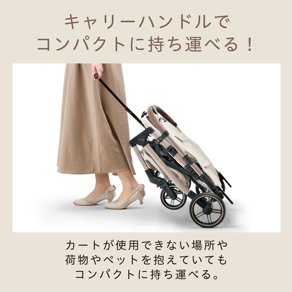 【キャリーハンドル付】折りたたみ時の持ち運びもらくらく。カートが使用できない場所や荷物やペットを抱えていてもコンパクトに運べる。