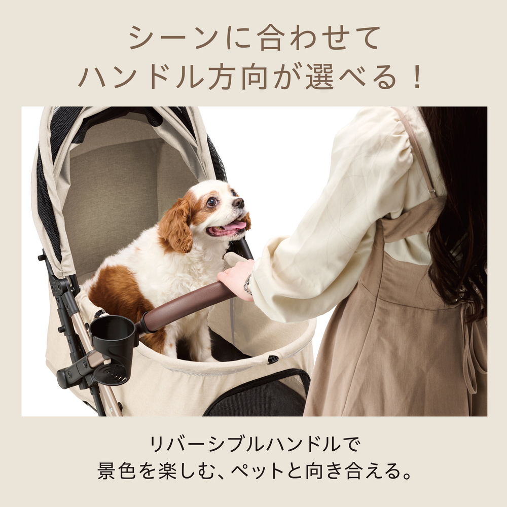 【リバーシブルハンドル】シーンに合わせてハンドル方向を使い分け。どちらでもペットの様子がよく見え、触れ合えます。