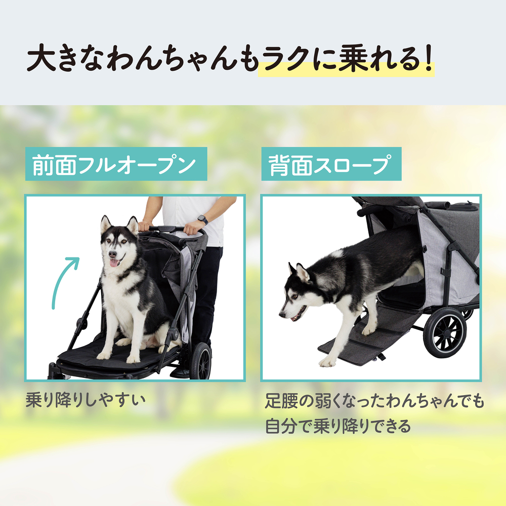 【スムーズな乗り降りをサポートする独自機能】前面がフルオープンになるだけでなく、背面にはスロープが搭載されているため、足腰の弱くなったワンちゃんでも自分での乗り降りが可能です。