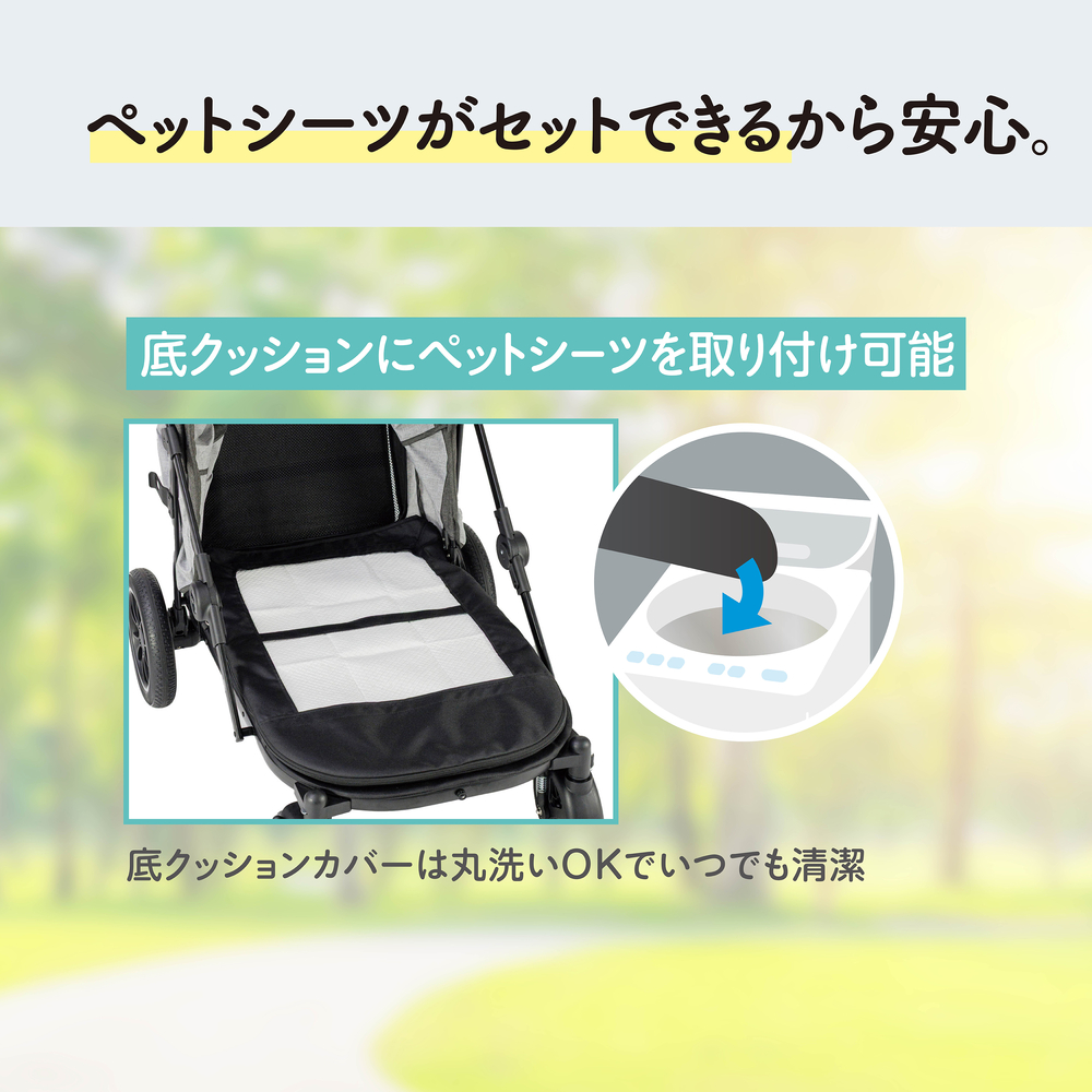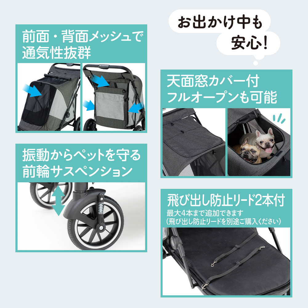 【ペットの快適さと安全性を追求した構造】通気性抜群の前面・背面メッシュや、路面からの振動を和らげてペットを守る前輪サスペンションが採用されています。