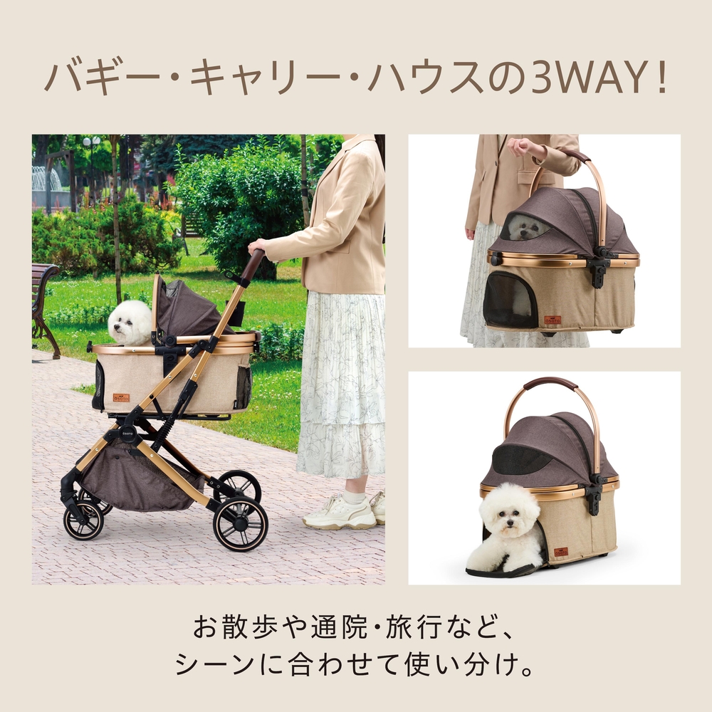 おでかけに煌めきを バギー・キャリー・ハウスと使い方が選べる便利な3WAY! 便利な3パターンの使い方ができるので、お散歩や通院・旅行など、シーンに合わせて使い分け。 本体バスケットはボタンで簡単に着脱可能。バスケットを取り外せば、折畳み簡単、コンパクトに収納ができる。フレームは便利な自立式。