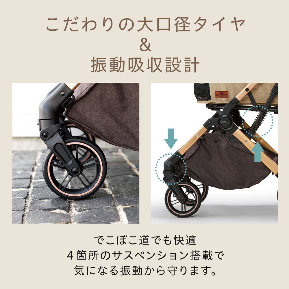 【こだわりタイヤ】大口径タイヤででこぼこ道でも快適な乗り心地&押し心地。前輪とフレームの計4ヶ所にサスペンションを搭載。気になる振動からペットをやさしく守ります。