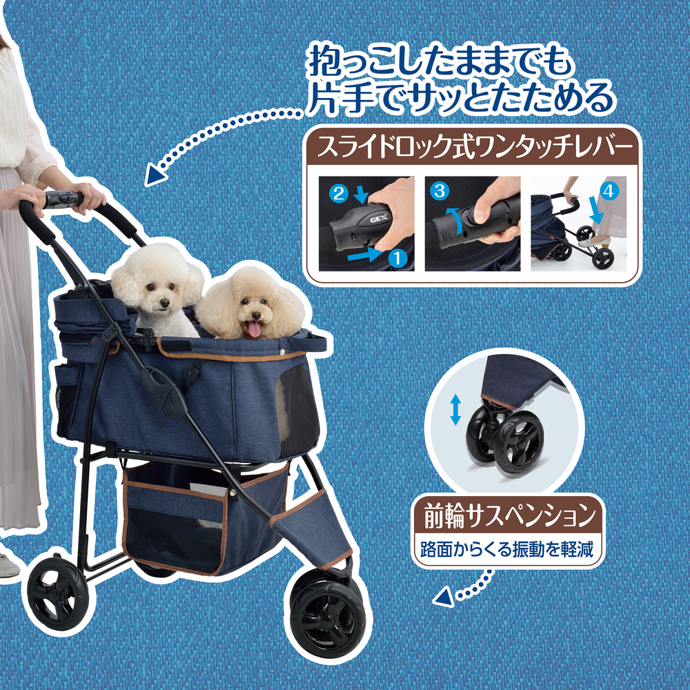 片手でたためるワンタッチレバー・・・愛犬を抱っこしたままでもサッとたためます。