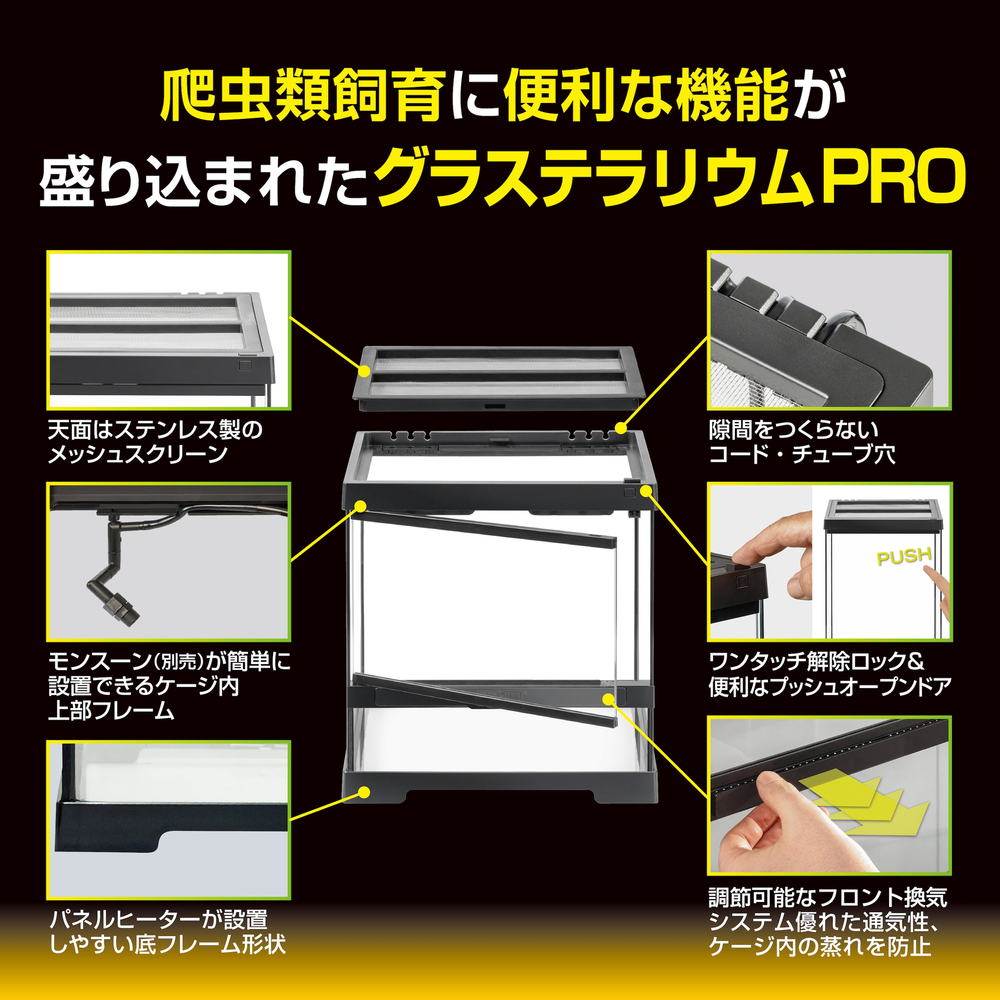| セット内容 | グラステラリウムPRO3030、レプタイルヒートS、アナログ温度計、デザートソイル2kg、ウォーターディッシュS、モイストシェルター コーナー130、レオパブレンドフード試供品、ヒョウモントカゲモドキ飼育ガイド付き |
