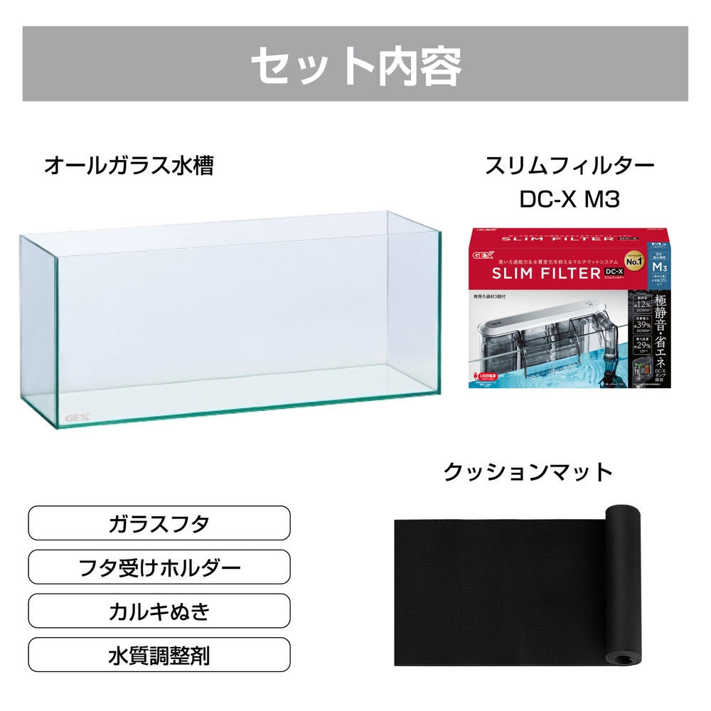セット内容 | ガラス水槽、スリムフィルターDC-X M3、ガラスフタ、フタ受けホルダー、クッションマット、カルキぬき、水質調整剤 |