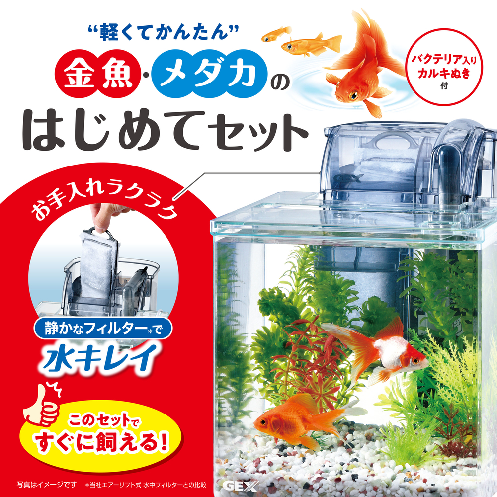 | セット内容 | プラスチック製水槽、外掛け式フィルター、フタ、水質調整剤 |