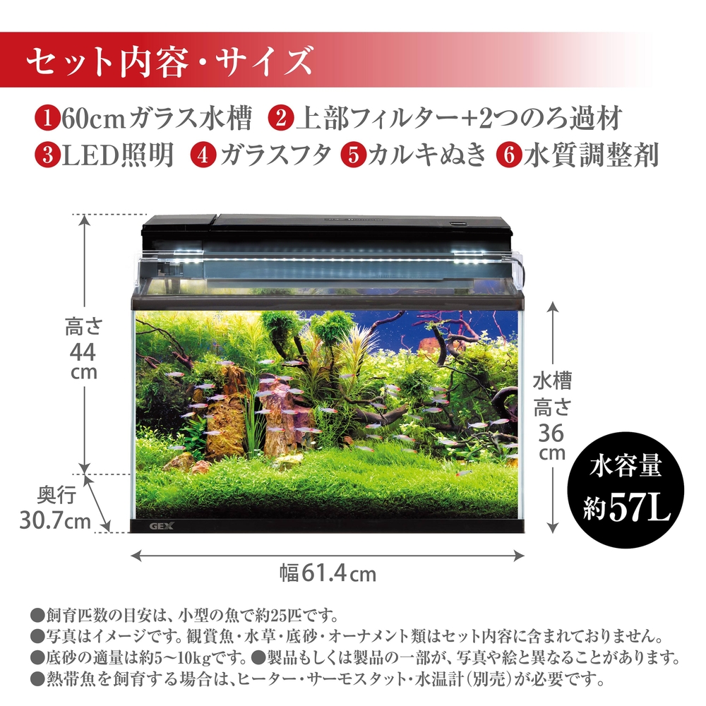 | セット内容 | 60cmガラス水槽、上部フィルター+2つのろ過材、LEDライト、ガラスフタ、カルキぬき、水質調整剤 |