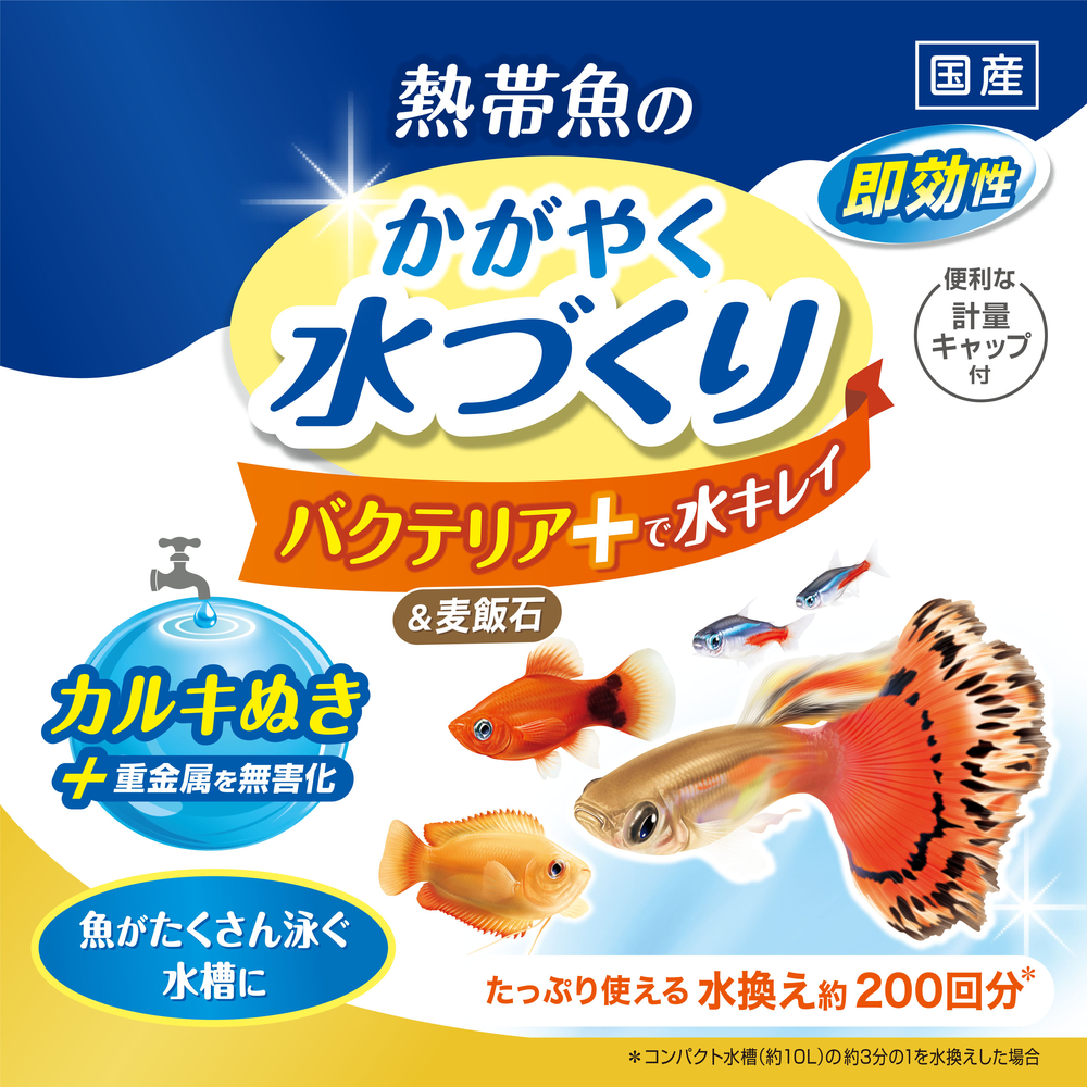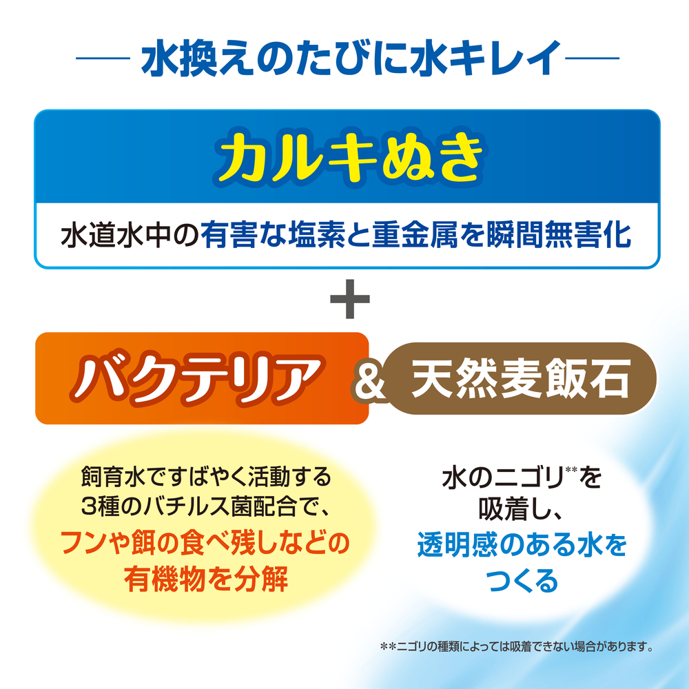 水換えのたびに水キレイ!バクテリア&麦飯石配合のカルキぬき。水道水流の有害な塩素と重金属を瞬間無害化。飼育水ですばやく活動する3種のバクテリア配合で、フンや餌の食べ残しなどの有機物を分解!