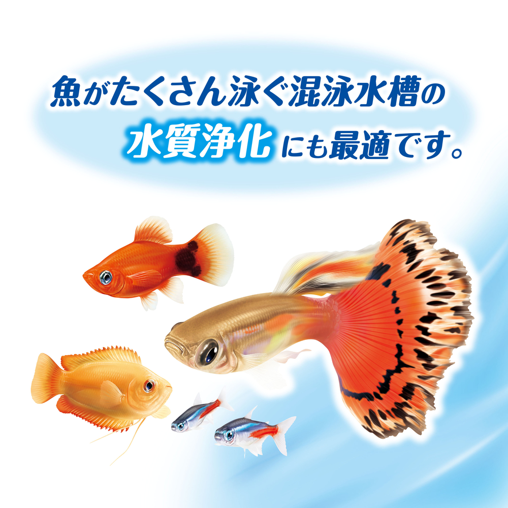 【水質浄化バクテリア配合】: 飼育水ですばやく活動する3種のバチルス菌が、フンや餌の食べ残しなどの有機物を分解。