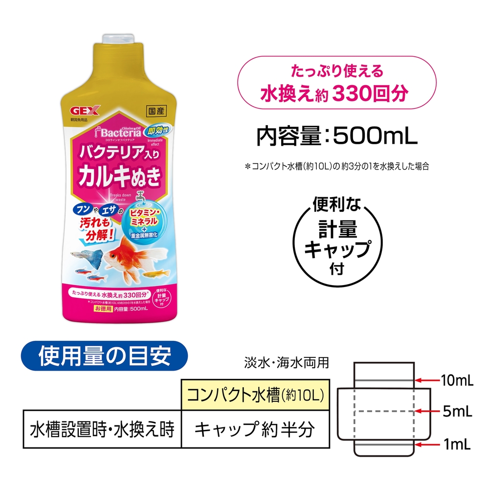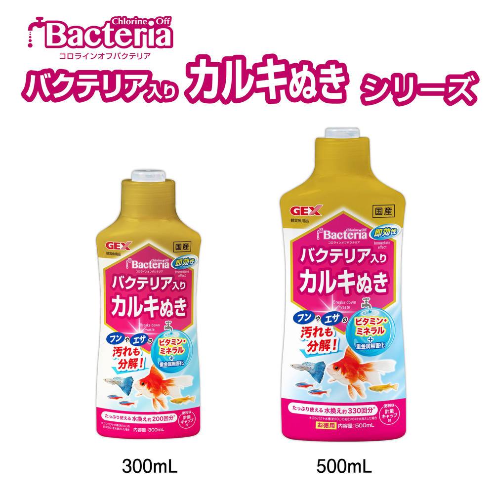 【カルキぬきにバクテリアをプラス】:カルキ(塩素)除去と同時にバクテリアが汚れを分解し、水換えのたびに水をきれいに保ちます。