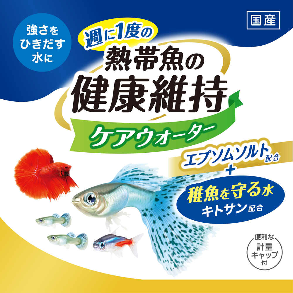 エプソムソルト配合で熱帯魚の強さをひき出す水に!天然抗菌成分キトサン配合で飼育水の雑菌を抑え稚魚の成長をサポート。水草にも使用可。便利な計量キャップ付き。