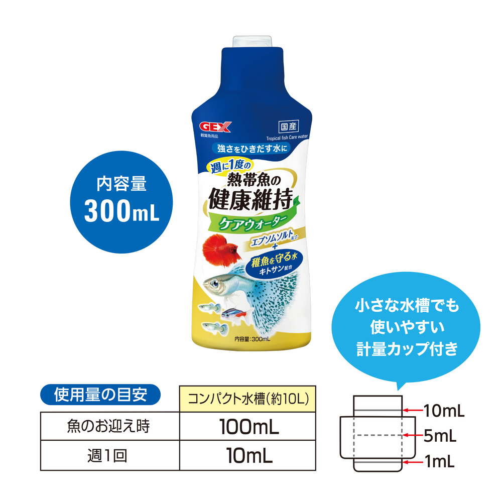 【天然抗菌成分キトサン配合】:飼育水の雑菌を抑え、稚魚の成長をサポート。また、エビや水草水槽にも使用可。