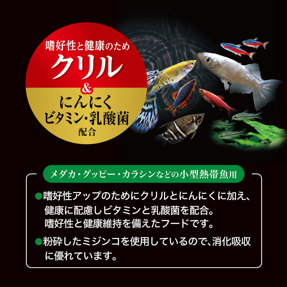 【幅広い魚種に対応】:メダカやグッピー、カラシンなどの小型熱帯魚など、幅広い魚種に与えていただけます。