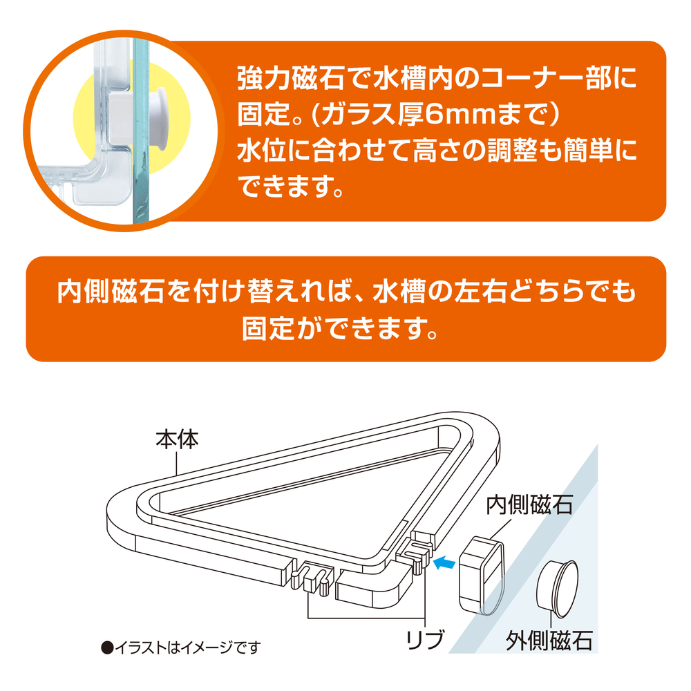 【強力磁石を使用!】:強力磁石で水槽内のコーナー部にしっかり固定できます(ガラス厚6mmまで対応)。水位に合わせて高さの調整が簡単にできます。