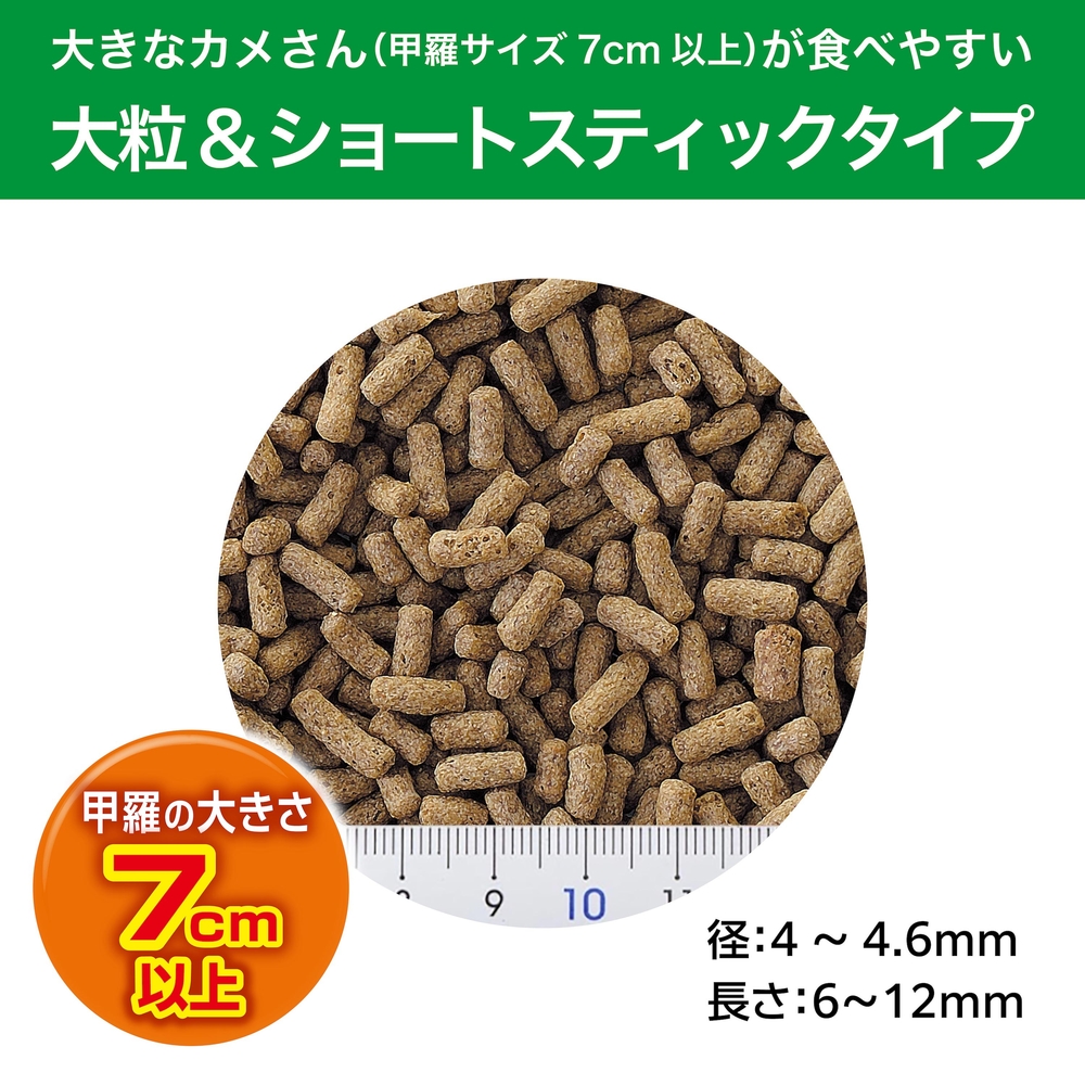 【粒サイズ・形状】: 甲羅の大きさ7cm以上のカメに適した「大粒」サイズ。カメの口のサイズに合わせた、食べやすいショートスティック形状!